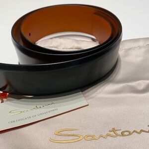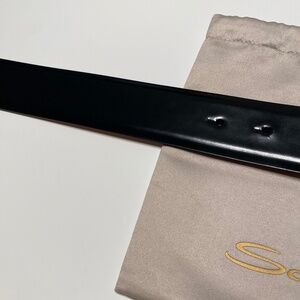 Classic black leather belt with gunmetal Santoni logo, made in Italy. Santoni uses select, top quality leather for their products. Worn once, no flaws. Comes with original box, all original packaging, and dust bag. It's packed and looks brand new, would make a great gift. Size 36 (Euro size 90).