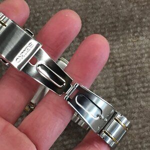 The item is a Seiko stainless steel gold and silver colored watch. The watch has a date at the 3 position and the hands will glow in the dark. The watch has a sapphire crystal and a threaded back. The watch is water resistant up to 100 meters deep. The case is 40 millimeters wide and the lug width or band width is 20 millimeters. The watch is battery operated and will come with a three year warranty. I will provide all the paper work and the box.
