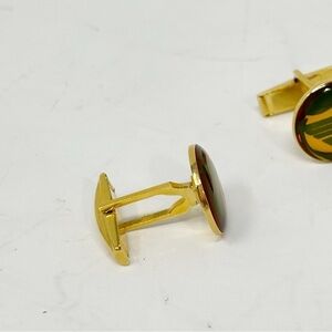 Men’s Set Of Two Gold Tone Cuff Links 1/2” Diameter Green Enameled Design. Good pre-owned condition. Gentle signs of wear. See photos. All measurements are approximate.