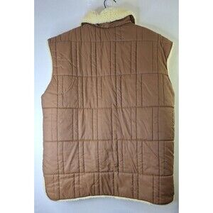 This is a men's puffer vest in size XXL with a sherpa lining, snap button closure, and multiple pockets. The vest is suitable for outdoor activities and workwear, featuring a stand-up collar and a vintage style. Made of polyester with a softshell fabric type, it is lightweight, breathable, and packable. The brown vest is designed for winter, fall, and spring seasons, offering comfort and functionality for activities like walking, hunting, skiing, and hiking. PTP 27.5 in. Length 33.5 in.