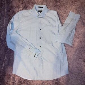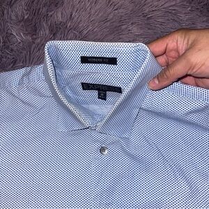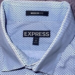 1- Express small blue polka dots, long sleeve, modern fit, Sz M 16-16 1/2, does have some discoloration on collar but can be treated. Retail $78