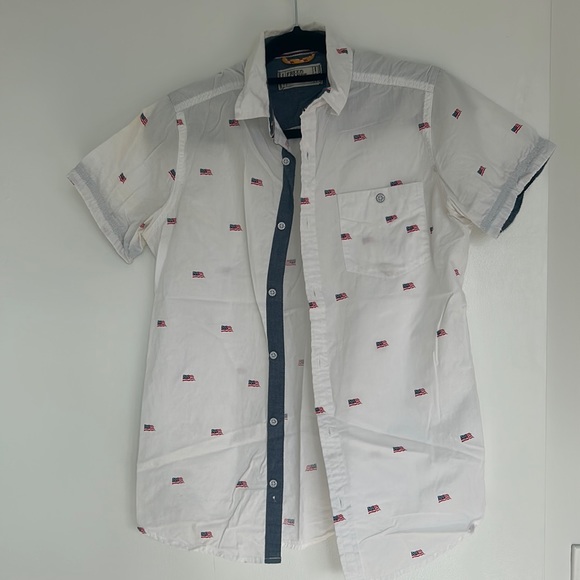 Men’s short sleeve button down, white with American flag pattern, front left pocket, collar, size small, Free Planet brand, only worn once