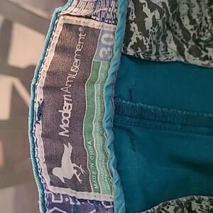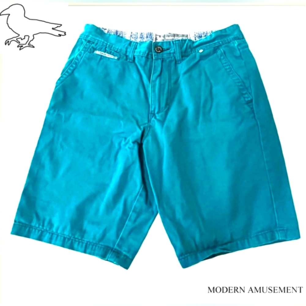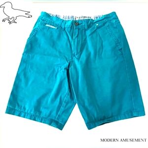Blue-green cotton shorts with two deep front pockets, two back button pockets, good condition, size waist 30