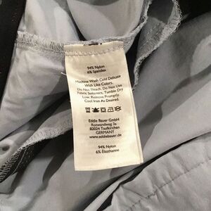 Eddie Bauer Mens Shorts, 44, Light Blue, High Performance. These shorts are made to be comfortable for the active man. The front pockets zip closed. The waistband has wide elastic for a smooth silhouette and comfort. Two back welt pockets. Fabric content: 94% nylon, 6% spandex. Easy care: machine wash / dry. Waist measured laying flat: 22”. Inseam: 8”. Excellent pre-worn condition.