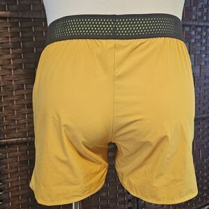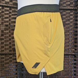 These are men's running shorts in a yellow color. They have a black waistband and a zippered pocket on the right side. The shorts are new without tags or box.