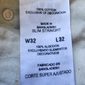 Good condition men's jeans. I don't think these came with the cut knees - right knee is a cut/slit and the left leg is a hole. 100% Cotton.