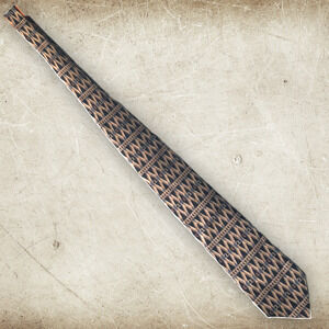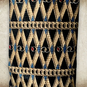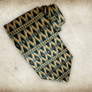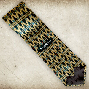 Elevate your formal look with this Kenneth Cole men's silk tie from the New York Collection. The tie features a striking geometric pattern with black as the base color overlaid with a goldish tan pattern with small blue and red highlights. Crafted from high-quality silk fabric, this tie is durable and comfortable to wear. The adjustable tie is designed with a classic width and is suitable for any occasion, whether it's a business meeting or a formal event. Made in the United States, this tie is a must-have for any fashion-conscious man. Complete your outfit with this stylish and timeless accessory.