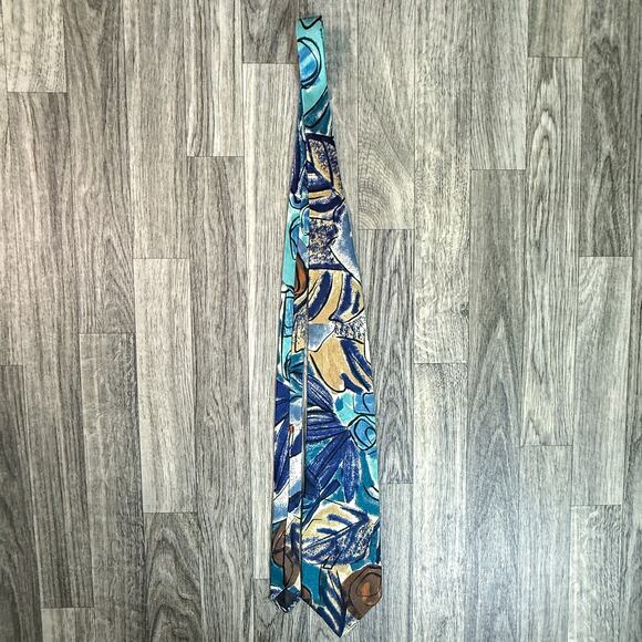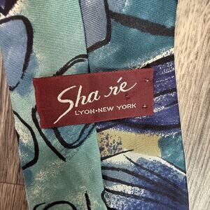 This is a superb quality men’s necktie by Sha r’e Lyon New York featuring a bold abstract print in turquoise, navy, gold, and brown tones. Label reads “From Italy Hand Fashioned” and “Made in U.S.A.” (SM 08330) indicating high-quality construction. The fabric appears smooth and lustrous, and overall the tie is in excellent condition. A great addition for collectors of designer ties or for someone seeking a stylish accessory for work or special occasions.
