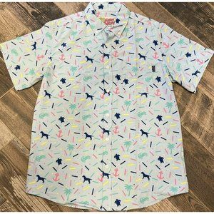 Add some fun to your wardrobe with this Simply Southern Life Of The Party button shirt. The multicolored, woven polyester blend fabric features a unique print that includes cars, car turtle dog, animals, and dogs. The short-sleeved shirt has a collared neckline with a button-down style and closure. It is machine washable and comes in size M. Perfect for a casual, beachy look, this shirt is a must-have for any fashion-forward man. Pit to pit 22.5” New without tags