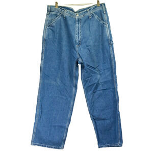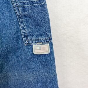 Elevate your style with these vintage Ralph Lauren carpenter jeans. The jeans are made of high-quality cotton denim material and come in a classic blue color that is perfect for any season. They feature a mid-rise waist with a relaxed fit style, along with cargo pockets. The jeans have a zip and button closure and are machine washable for easy maintenance. They are available in size 38 with a 30-inch inseam. These timeless jeans are perfect for any casual occasion and will surely become a staple in your wardrobe. These vintage jeans are gently used in good condition. Inseam 30", waist 38", rise 14"