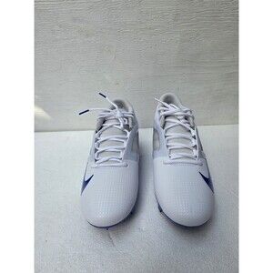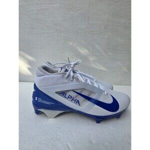 The product is a pair of Men's Size 9 Nike Alpha Menace 4 Pro Football Cleats in white and royal blue color scheme. These cleats feature a lace-up closure, mid-top shoe shaft style, and synthetic upper material with a foam insole for comfort and performance. With a plastic cleat type and standard shoe width, these athletic shoes are designed for football enthusiasts looking for high-quality footwear that can be worn in all seasons. The Nike Alpha Menace 4 Pro cleats also showcase the iconic Nike branding and are part of the Nike Alpha product line. NO BOX[ NB6]