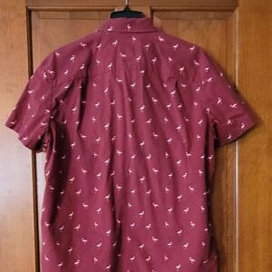 Great used condition. Men's size large, American Eagle, casual button down top. Maroon with flamingo print. No stains or rips. All items are cross posted on various other websites.