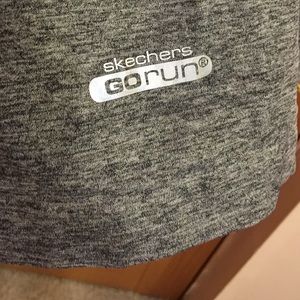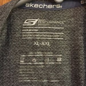 Men's brand new Skechers grey sport shirt size XL. This is a very stretchy material and could easily fit a size large. It is very long tho and the sleeves are long as well so you'd have to be pretty tall to fill it out. The sleeves also have thumb holes on them. All of the info about the material and shirt is on the tags (shown).
