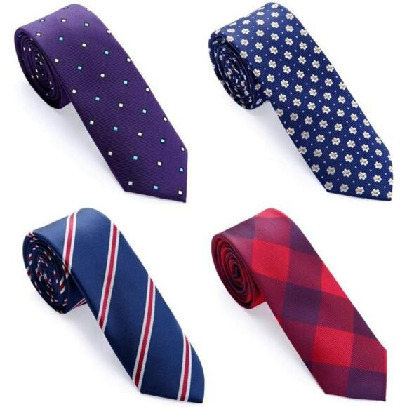 This skinny necktie set in 4 packs assorted colors and patterns,it included jacquard Red skinny tie, Black stripes slim tie texture , Gray Skinny tie textured,grid green neckties etc, those unique skinny neckties are here for any occasion and every sense of style,such as match for suit shirt,vest,suspenders etc