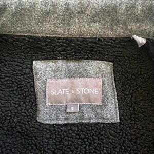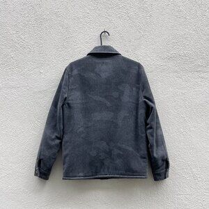 Men's Slate & Stone Gray Camouflage Sherpa Lined Shacket Jacket. Extra warm shacket with black sherpa lining, snap button closures and 4 front pockets (2 chest + 2 hip). Subtle camo print. In good condition. Size Small.