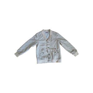 Men's Slvdr faux shearling fur lined, button-down beige, jacket size, medium. The jacket is in good condition with various blemishes on the cuffs. The jacket has button pockets and a zipper pocket.