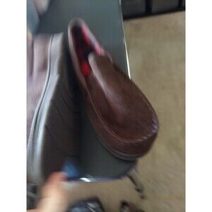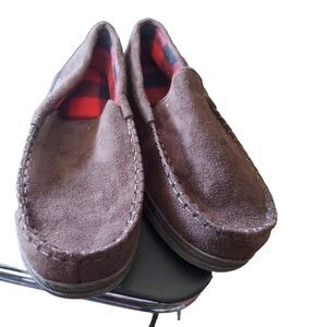 Men's Small (7/8) Brown Slippers Fuzzy Red Black Plaid Insole Moccasin Slip On