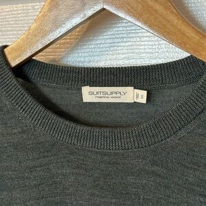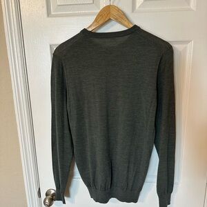 Only worn a handful of times. Slim, size small, thinner Marino wool sweater in a dark olive green. Versatile style for fall/winter and very comfortable.