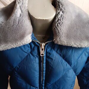 This durable men's jacket features down insulation and a cozy shearling collar. Its quilted design ensures warmth and style, suitable for cold weather.