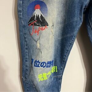 Men’s Smoke Rise Tokyo Ferry Blue Taper Stretch Distressed Denim Jeans with Patches & Print