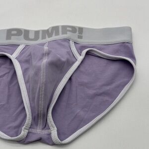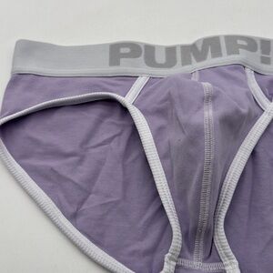 This product is a pair of men's solid cotton briefs in a soft lilac color, featuring a unique milkshake pouch design. Made from breathable microfiber cotton, these underwear are machine washable and designed for all seasons with stretch fabric for added comfort. The briefs are in size Large (L) and are part of the PUMP! brand, offering a stylish and functional addition to any man's underwear collection. Perfect for those looking for a solid, pouch-enhanced brief that provides both style and comfort.