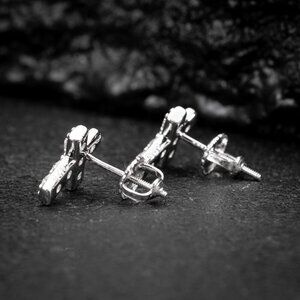Iced Cz small prong set white gold cross earrings men: Our mens cross studs are iced with 5A cz stone hand set, offering you the most dazzling and cool earrings for men. Step up your style game with these stunning Ice Out Earrings Men.