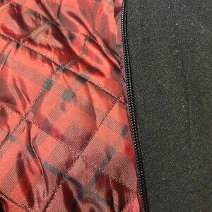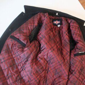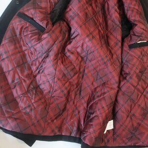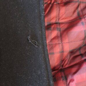 PRE-OWNED, 3RD BUTTON FROM THE TOP IS MISSING AND THE COAT HAS A ZIPPER ALONG THE TRIM OF THE COAT LINING (SEE PICS) OTHERWISE IN VERY GOOD CONDITION.