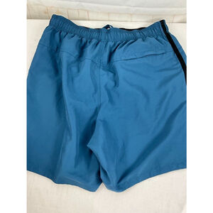 This is a Men's Swim Trunks by Speedo. It is a size Large. It is 100% Polyester. It is preowned but in excellent condition.It has elastic waist, drawstring, embroidered logo, pockets, blue in color.