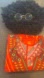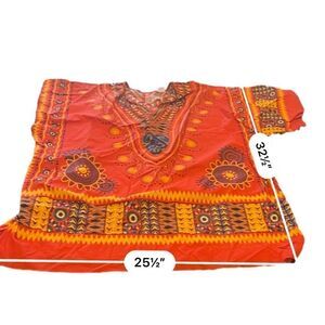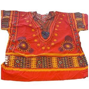 This is a new, unworn, and unwashed "Spirit" Halloween brand, size L/XL, red, yellow, black, and blue patterned, short-sleeved, V-neck, 100% polypropylene, African-inspired shirt. The shirt measures 25 1/2 inches wide and 32 1/2 inches long. It comes with a black afro wig and a pair of round, blue-tinted, gold-rimmed sunglasses. The shirt has no tags or box. The wig and sunglasses are new and unused. The shirt is made of a lightweight, breathable fabric. The wig is made of synthetic hair.