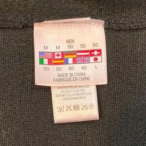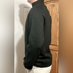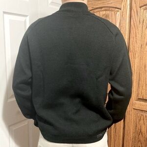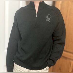 Mens Spyder sweater, 1/4 Zip, very heavy duty, but still soft, wool blend. Black, with the Spyder logo on the left chest, and the name "Spyder" on the hem on the back right side. It says it's a Medium, but it's very generous, both length and width. The model is 6' and is a size Large, and this fit him with room to spare. Excellent preowned condition, like new.