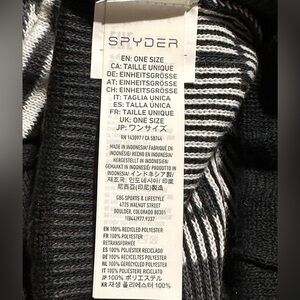 Spyder Men's Icebox Hat one size gray & black Condition new with tags excellent The Icebox beanie features bold stripes and a colorful pom pom, plus a full fleece lining inside. 100% recycled polyester thread Unlined rolled edge Multicolor yarn pom pom Woven logos 3MTM ThinsulateTM Insulation Thin yet protective, the trusted warmth of 3MTM ThinsulateTM Insulation is your low-profile answer to cold . The microfibers that comprise 3MTM ThinsulateTM Insulation efficiently trap insulating air and reflect radiant body heat and provides nearly twice the warmth of high-loft fiberfill insulations and about one-and-a-half times the warmth of down Sexier, higher-tech and lower-profile than James Bond, Bemis adhesive films bond various materials together for a no-stitch, abrasion-resistant outcome . This means your garment has a higher waterproofness and greater durability . And the look? Sleek and technical with virtually no volume added . Exclusive to Spyder, Core is a special weave rib-knit face material with fleece-backed fabric that has the look and feel of a sweater with the technical performance and comfort of a soft shell SPYDER Time to dominate without getting cold and wet . Dry W .E .B .TM technology works to absorb and transport perspiration . Capillary action pulls moisture away from the skin and then disperses for quick evaporation . You’re left feeling warm and dry, not to mention smelling fresher; this fabric is treated to resist odor-causing bacteria .