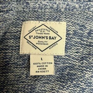 This St. John's Bay sweater is a must-have for any men's wardrobe. The sweater features a stylish 1/4 zip design and comes in a classic blue color, perfect for any occasion. Made with comfortable cotton material, this sweater is perfect for cooler weather and the long sleeves provide extra warmth. The sweater is size Large and has a regular fit, making it a great option for men of all shapes and sizes. Don't miss out on this versatile and stylish piece for your wardrobe.