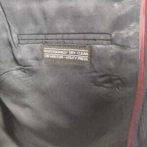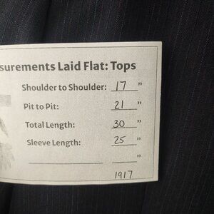 Basic blue jacket with white/red pinstripe detailing. Bought 2nd hand for a costume, never did find a size label. My partner usually wears 38/40 suit jacket and this was a bit snug on him. Please see measurements for sizing.