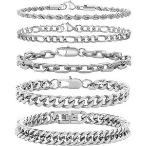 5 Classic Designs in 1 Set : This stackable bracelets for men consists of a 5 style chain bracelets. Including a rope chain, paperclip chain, figaro chain, and 2 cuban link chain bracelets. You have a choice how you wear them for your everyday,they look great stacked together or individually, bold and elegant enough to suit all styles of clothing. Also economical choice for you.
