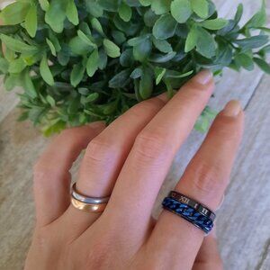 Create your own unique style with this stunning black stainless steel wide-band spinner ring, featuring roman numerals and a metallic blue rotating chain mechanism that can rotate and spin around the main black band, providing a fun and stress-relieving activity! Crafted from high-quality hypoallergenic stainless steel, this unisex designed ring is built to withstand daily wear and tear, comfortable fit, ensuring long-lasting durability and resistance to scratches. Suitable for casual wear to formal events. Can be used as a Wedding Band, Promise Ring, Thumb Ring, Statement Ring, Fidget Ring, Anxiety Relief or Spinner Ring.