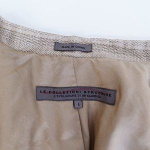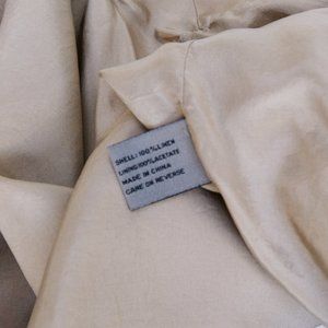 Tan linen blazer coat with a mandarin stand collar and patch hip pockets. Features a subtle vertical stripe pattern.
