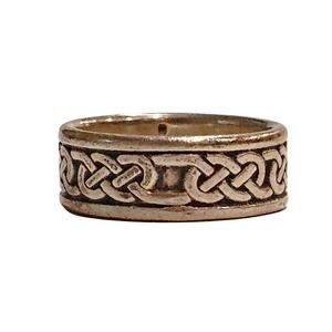 This handsome and meaningful ring is a men's wedding band crafted from durable sterling silver. The band features a continuous Celtic knot pattern, a timeless motif often used in wedding jewelry to symbolize eternal love and connection due to its unbroken, interwoven lines.