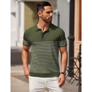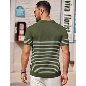 Mens Striped Polo Shirt Short Sleeve Knit Casual Slim Fit Golf Top Army Green