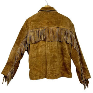 Vintage Suede 100% Fringed Western Cowboy Jacket with polyester lining. Has fringes front back and down sleeves. Made by Saddlery. Made in Korea. Men’s size 44. This jacket is HEAVY!