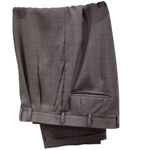 Men's Suit- Custom made by Angel Tailors, 42 Regular, 4 button jacket, 34 inch waist, 29 inch long pleated pants with cuffs. Taupe with Brown Windowpanes, 100% wool. In good condition.
