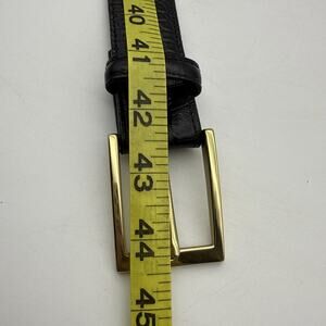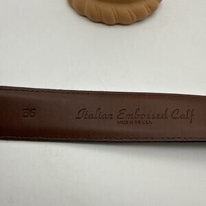 This Men's TORINO Italian Embossed Croc Calf Leather Black Belt in size 36 is a stylish and versatile accessory made in the USA. The belt features a unique animal print crocodile pattern with a vintage touch, perfect for adding a touch of Italian flair to any casual outfit. The adjustable belt is crafted from high-quality leather with a classic black color and a sleek buckle accent, making it a timeless piece for any man's wardrobe.