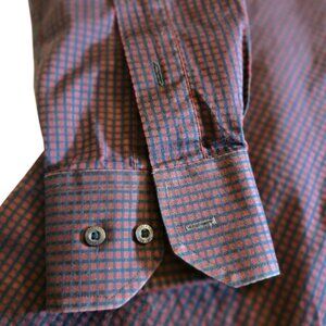 Deep red and Very dark navy check/plaid print long sleeve dress/casual shirt. Good pre-owned condition. It was very hard to capture the color in a photo. I think the first photo represents it best.