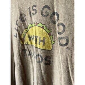 The product is a men's T-shirt by Life is Good in size large, featuring a green color and a design that life is good with tacos. This regular fit shirt is perfect for those who enjoy a casual yet stylish look, and the unique taco graphic adds a fun and playful touch to the overall style. Ideal for casual wear, this top is both comfortable and fashionable for everyday wear.