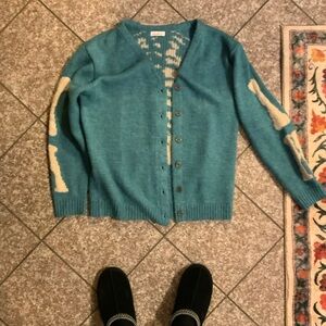 Turquoise knit cardigan featuring cream skeleton ribcage + bone design across back and sleeves. Kapital-inspired design – same look without $400+ price tag. Standout layering piece, cozy knit.