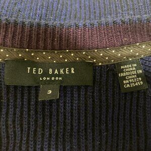 A men's Ted Baker sweater. Dark blue crew neck, size 3 (US 38). Collar 15.5 inches. 42% polyester, 29% acrylic, 20% polyamide, 9% wool. Decorative trim around collar, small logo on side. Medium weight, warm and comfortable. In very good condition.