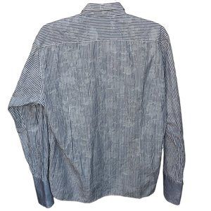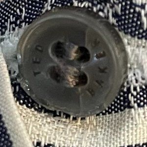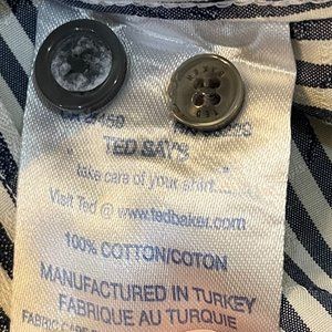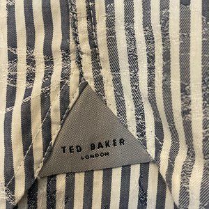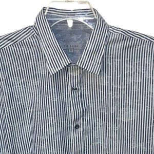 Men's Ted Baker London Grey/White Stripe Button Down Dress Shirt Size 6 (2XL). Made of 100% Cotton. Measures Pit to Pit 24", Length 30". This shirt is in excellent condition. 2 buttons have damage but there are extra buttons are included. There are no rips, tears, stains or damage. Ships from a Smoke Free Home. Any questions, please ask. All reasonable offers welcome.