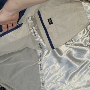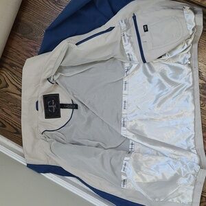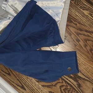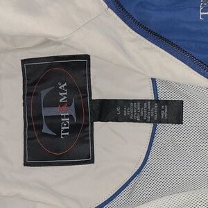 Previously owned and gently worn. Blue wind breaker by Tehama. Fully lined. Zip closure. LOTS of pockets! Two sets of pockets on the front - one zippered, one not. Two pockets inside - one cell phone pocket, one zippered pocket. Snaps at the wrist. Size Large.