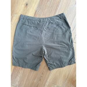 Olive green nylon shorts with mesh pockets, button, zipper and drawstring waist.