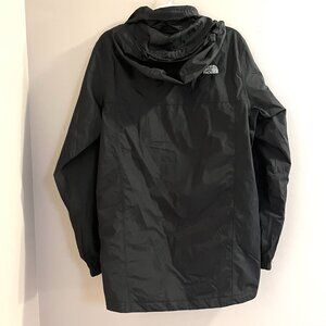 Men’s The North Face lightweight longline waterproof parka jacket in black. Has a zipper and velcro closure. The pockets are also zip up and the hood with a pullcord can be folded into the collar if you don’t want the hood out. Mesh inside has some pulling but overall in great condition.