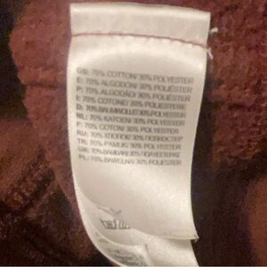 Good preowned condition. No stains, holes or tears, just normal wash wear. Burgundy color with orange hood and drawstrings. Pocket on each side. Pit to pit measures 25 inches across lying flat. Shoulder to bottom hem measures 29 inches. 70% cotton, 30% polyester.